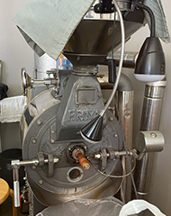 焙煎機とコーヒー豆(豆と粉どちらもご提供しています。1,120円/200g 深煎り1,180円/200g)、コーヒー 1杯250円